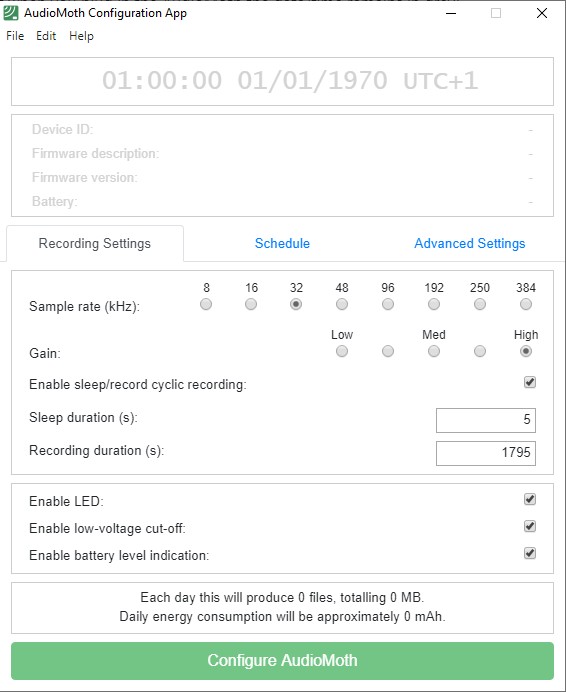 Do not plug in the AudioMoth yet. Start the AudioMoth Configuration App. It has three main tabs. For this basic setup we will use just the first (Recording Settings) and second (Schedule) tabs. When you first open the app the date and time at the top will be in grey and will show 01/01/1970 – this is fine and will not change until much later in the setup process.
