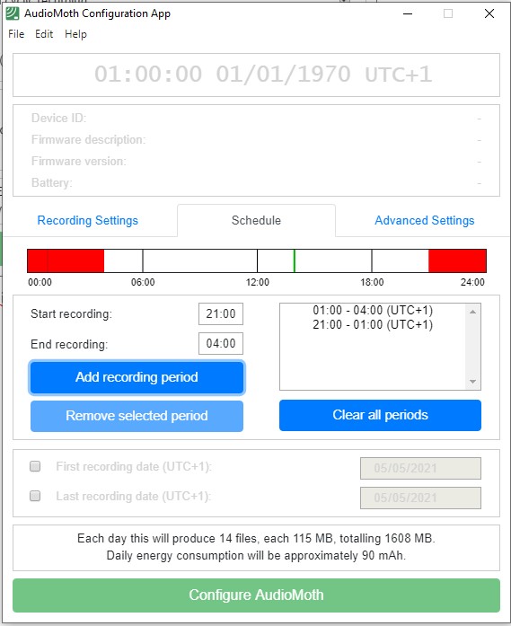 Here you can set the start and end times of recording. You can have multiple periods of recording (e.g. an hour at dusk and an hour at dawn) but for nocmig recordings you would usually just have a single period, for example, setting the start time at 21:00 and the end time at 04:00. After entering these times you must click the Add recording period button so that the times are listed in the box on the right. It is normal for your single period of recording to be split automatically either side of midnight as in the example below. Note also that now we have set the recording window the summary at the bottom of the app has updated to indicate that our particular schedule, file duration and sample rate will generate 14 files per day, each 115MB in size.