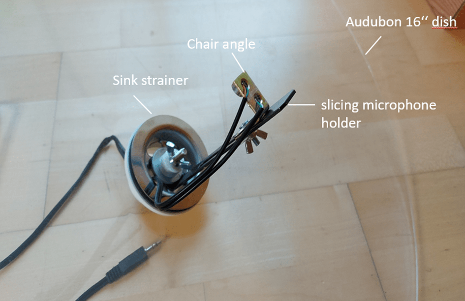 I inverted the screw of the sink strainer (so that it goes inside the dish). I then screwed a “microphone holder” on it, which is a metal piece I found at home (it is probably originating from an IKEA furniture, very similar to this one). The interesting feature is that there is a vertical opening which allows to slice your microphones in or out of the parabolic dish. Having your capsules a bit outside the dish, increases the probability to capture migrating birds calling from the side. However, you also increase the number of local birds on your recordings. Having one set of microphones inside, and another set outside the dish might compromise this issue (see further).