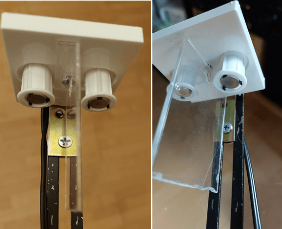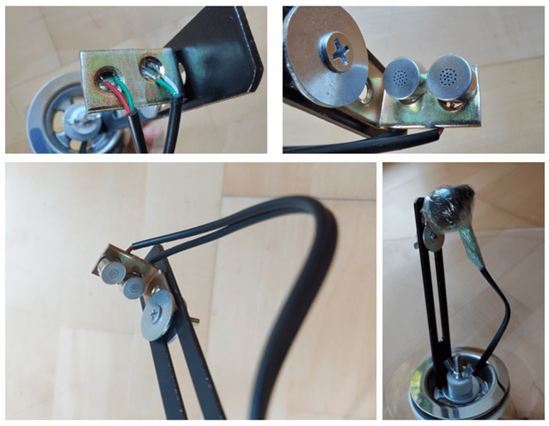 After soldering the capsules in the audio jack, I fixed these to this “chair angle”, that I then fixed on the “slicing” microphone holder (see Fig. 2). You can simply tape the wires and capsules to the chair angle. After that, do not forget to protect the capsules with a plastic cover (I simply use cling film, very thin and still waterproof).