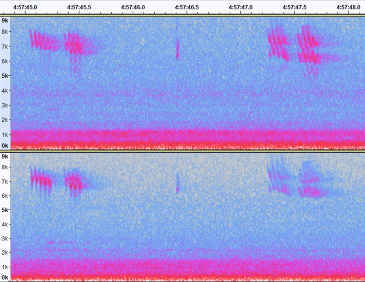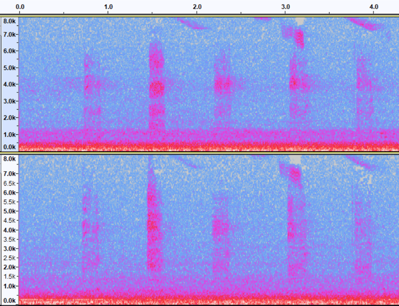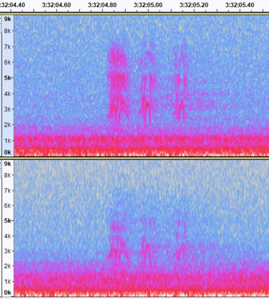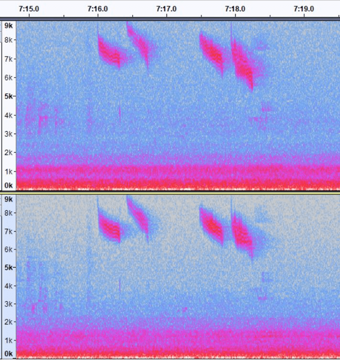 I compared my DIY parabolic dish with the Hi-Sound Mono dish (with 4 capsules) from Dodotronic (600 EUR inc. VAT and shipping) by recording three nights in October 2021. In a nutshell: results are very similar. Overall, both dishes have a comparable detectability (sometimes one dish captured better a far-calling bird than the other, probably depending from where the migrating bird was calling and/or the dish position). Four capsules increased a little bit the recording “power” compared with 2 capsules, but not significantly (so working with two capsules is perfect too). I had no local birds calling during the night, so this theory could not be tested. Here below some illustrations from the different recordings. Fig.6 illustrates birds at close range, and both dishes give comparable results. Fig. 7 and 8 show that some calls are more amplified on one or the other dish, probably depending on the angle from wish the bird called.