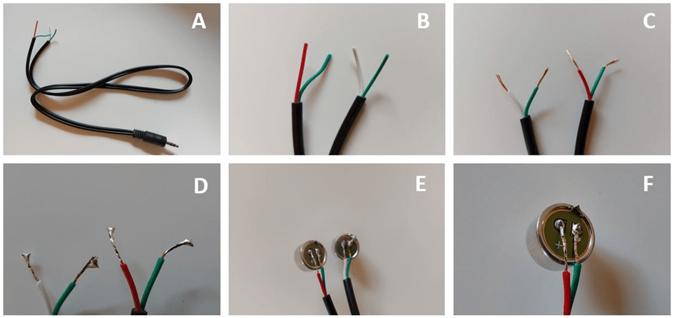 To build such a setup, you should solder a “bridge” between two capsules on the same channel (left or right), using again a piece of audio jack and the same soldering process as before by respecting the colour poles (+/-). Such a bridge is displayed on Figure 5.