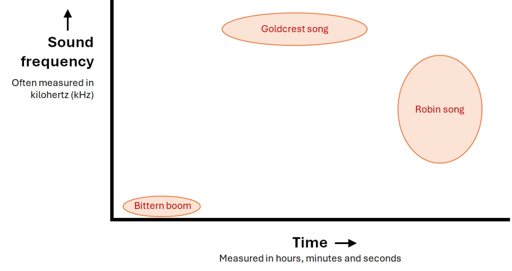 A spectrogram is a visual representation of sound. Its two main axes are time running left to right, and sound frequency (or pitch) running from bottom to top. Patterns of shading or colour within the spectrogram represent the amount of energy (which you can think of as volume) at a particular time and frequency. For example, a low frequency sound like a booming Bittern would be visible at the bottom of a spectrogram whereas a high pitch (=high frequency) sound like a singing Goldcrest would be visible at the top of a spectrogram. The song of a Robin, would fall somewhere in between these in frequency terms. In addition to the positions of the sounds on the spectrogram, the shapes on the spectrogram also convey meaning, with the wide-ranging Robin song spanning more frequency range than Goldcrest.